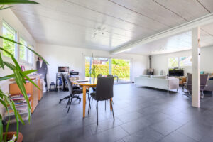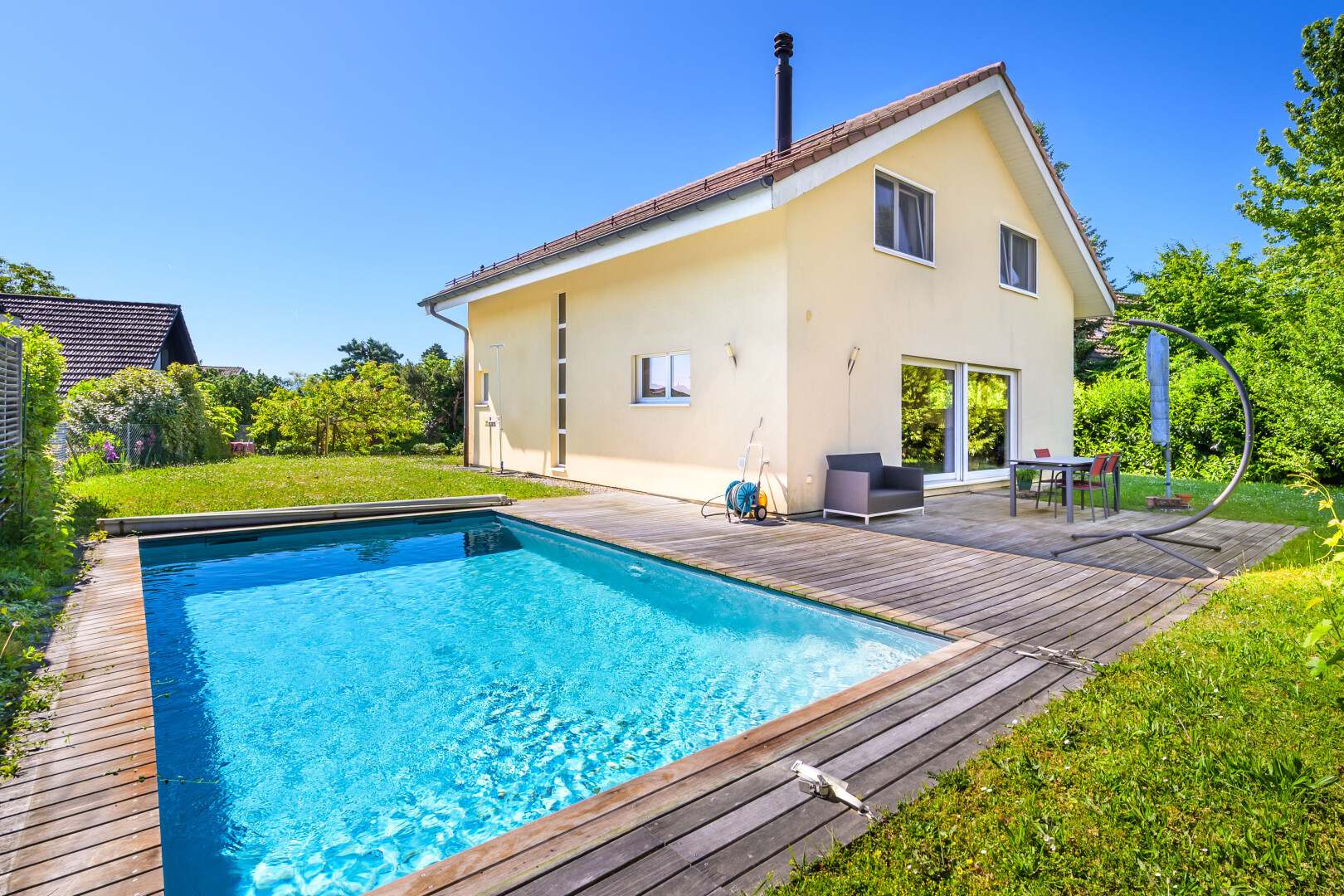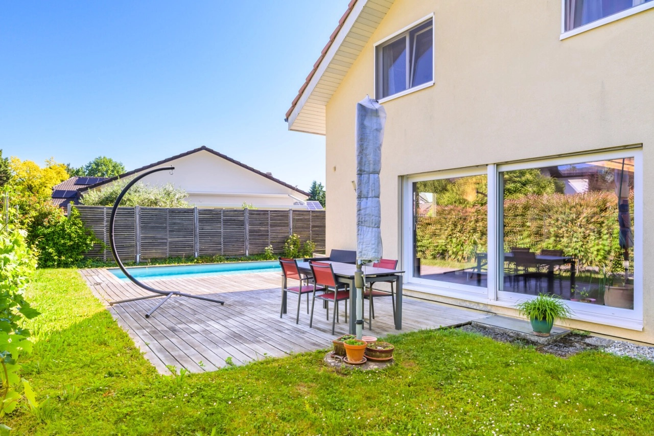 M Home vous propose dans un quartier résidentiel recherché et paisible de Trélex, cette maison individuelle qui coche les vraies priorités : calme, gare à pieds, grande pièce avec entrée indépendante, jardin parfaitement exploitable… et une piscine qui change la manière de vivre l’été.