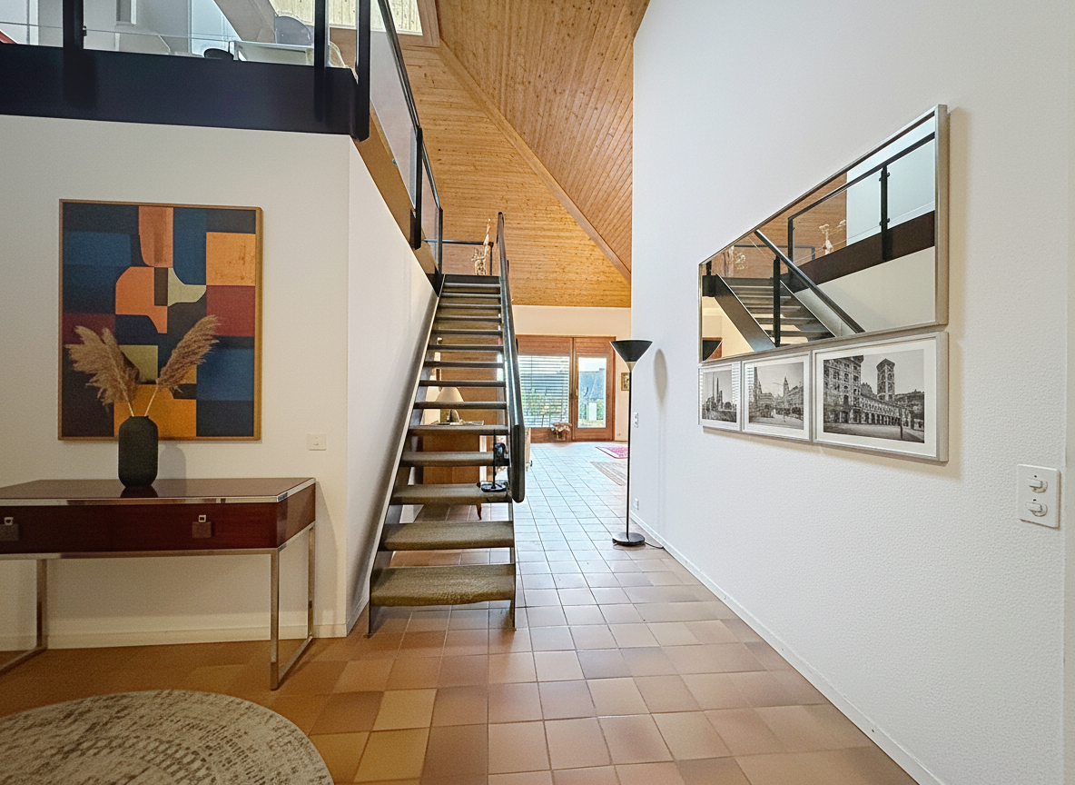 À Borex, dans un environnement résidentiel paisible, cette villa architecte de 7.5 pièces, dont 4 chambres, séduit par son très gros volume et son terrain de 1’716 m².